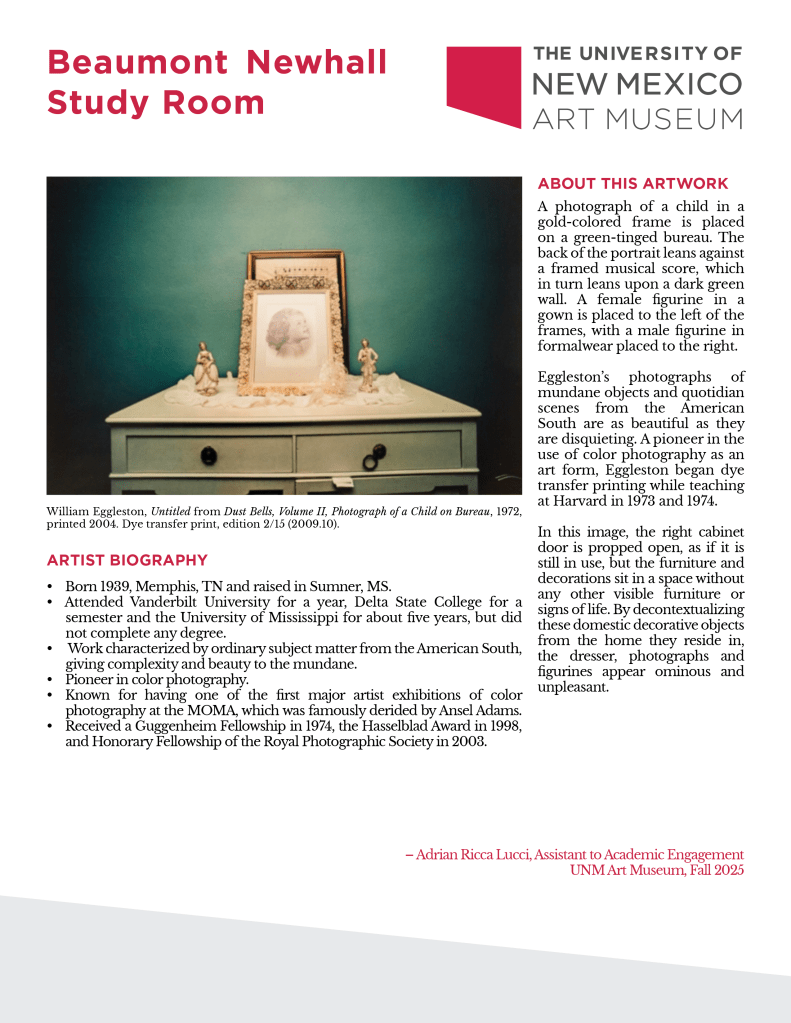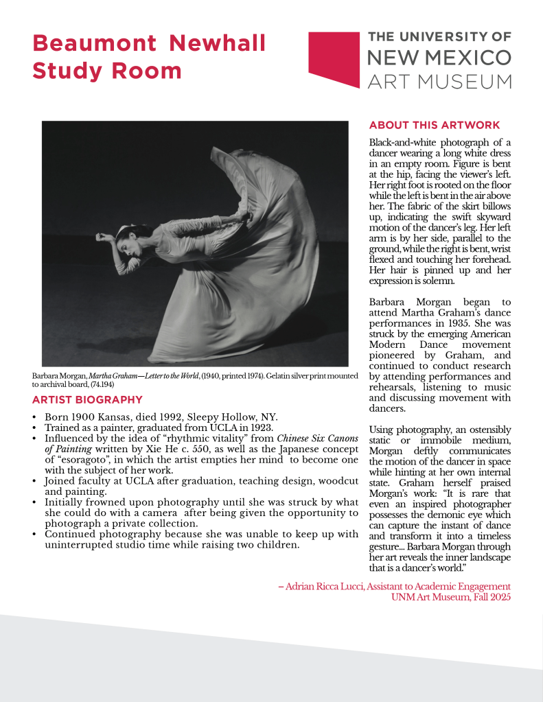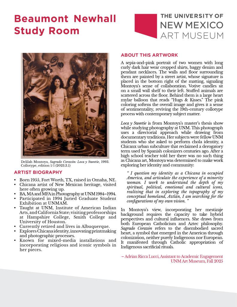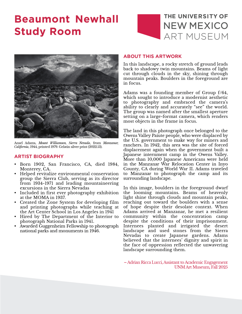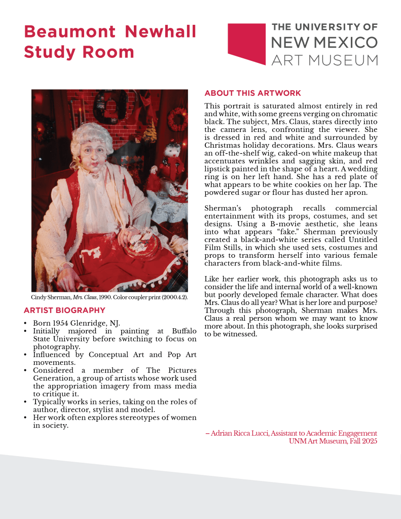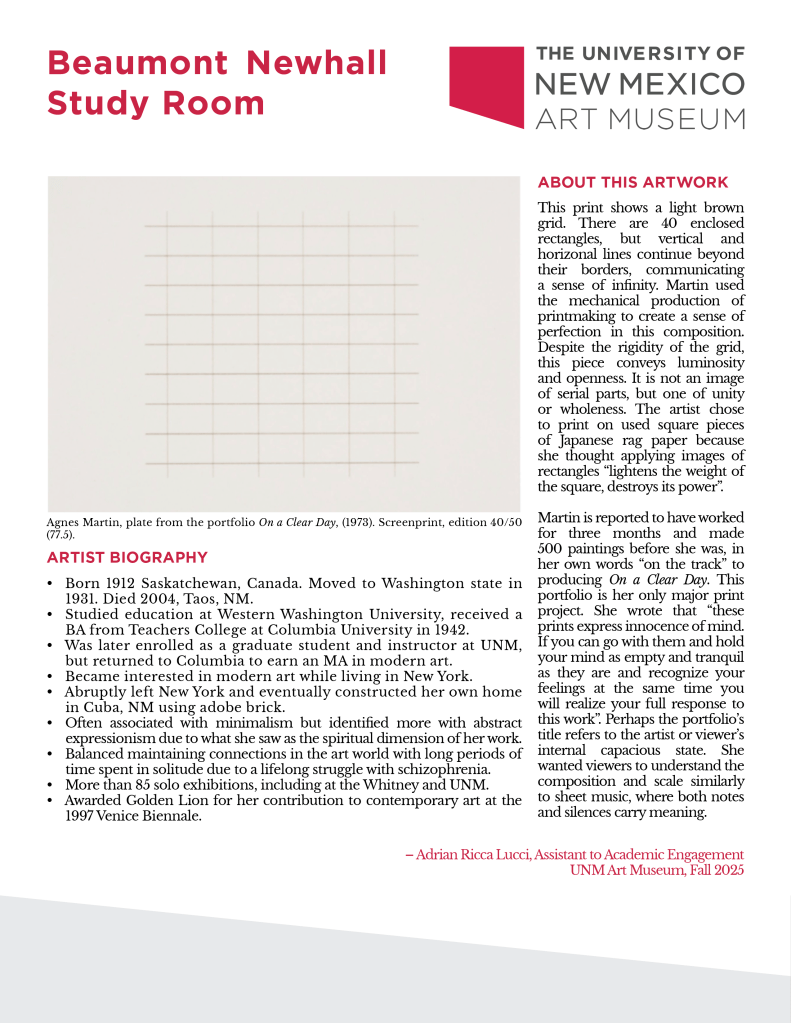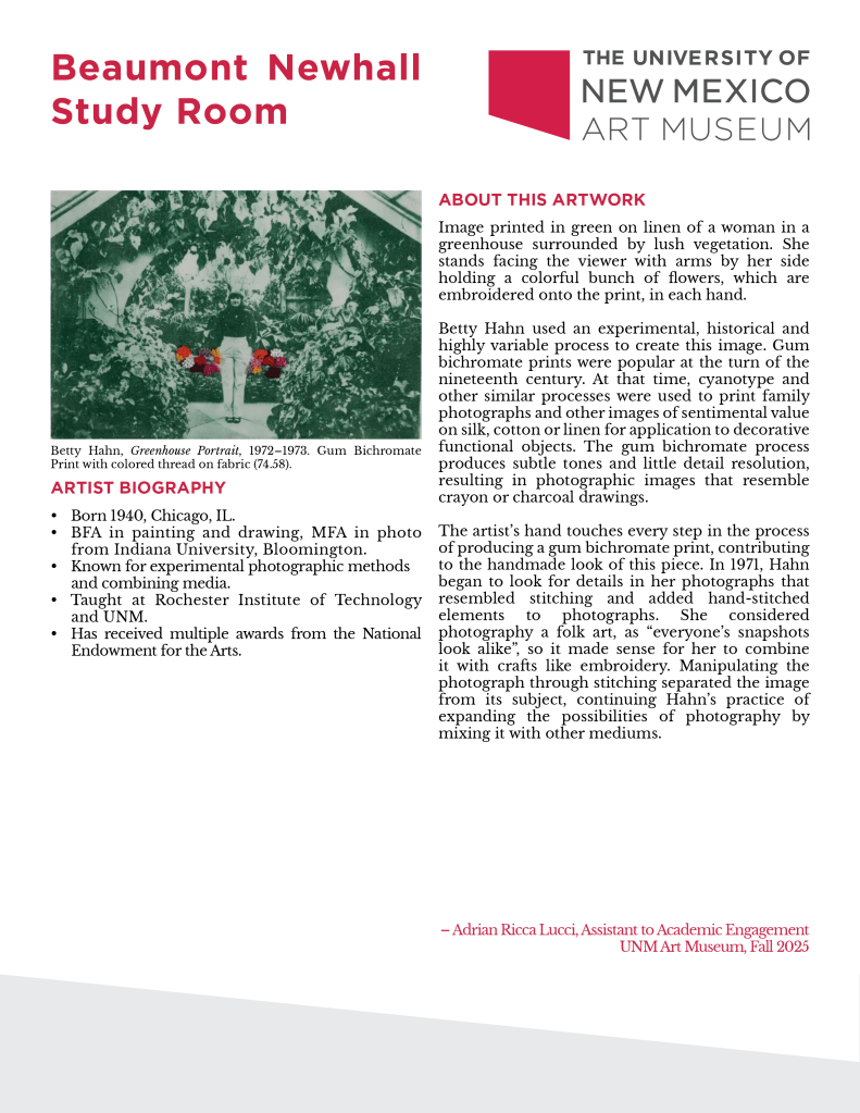 The UNM Art Museum’s biggest limitation is their ability to effectively display and discuss the unique stories behind each object of the collection. With over 30,000 pieces of art and only three primary gallery spaces there was a need to find an innovative way to make the art accessible. The Beaumont Newhall Study Room At-A-Glance sheet was that solution. Taking history reporting from study room assistants