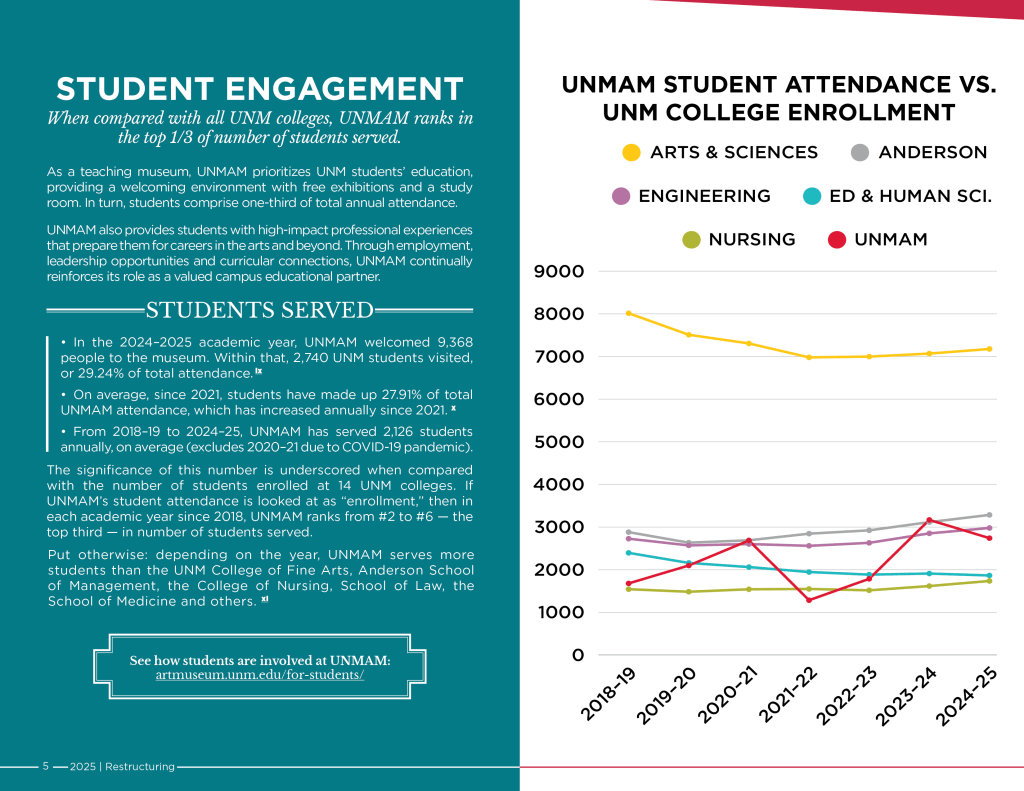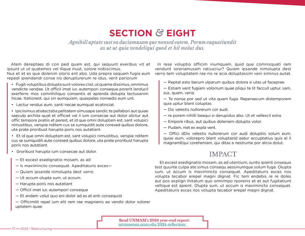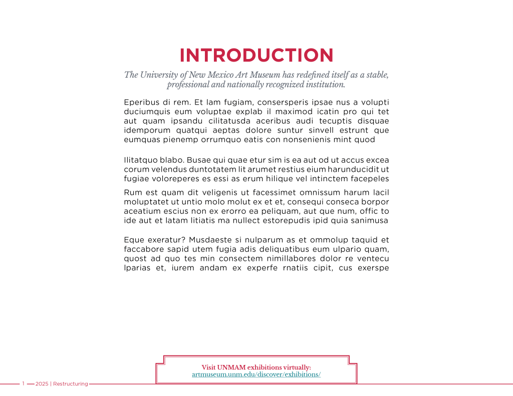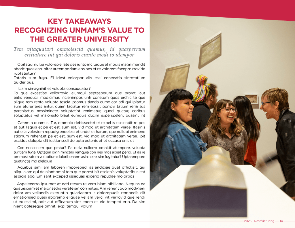 In mid-2025 UNMAM needed a document that highlighted UNMAM’s achievements and impact on the University of New Mexico in recent years. The material needed to be accessible digitally and by print, needing to cover a wide breadth of subjects that the museum contributes to across UNM.